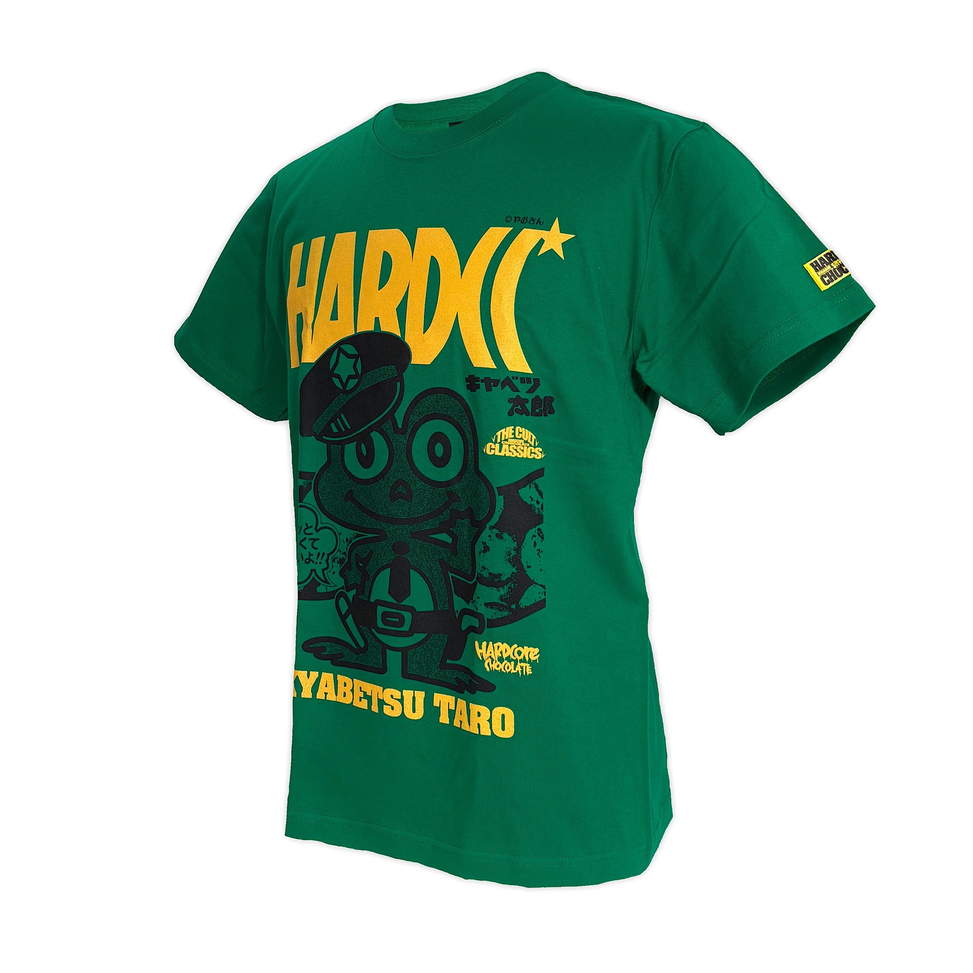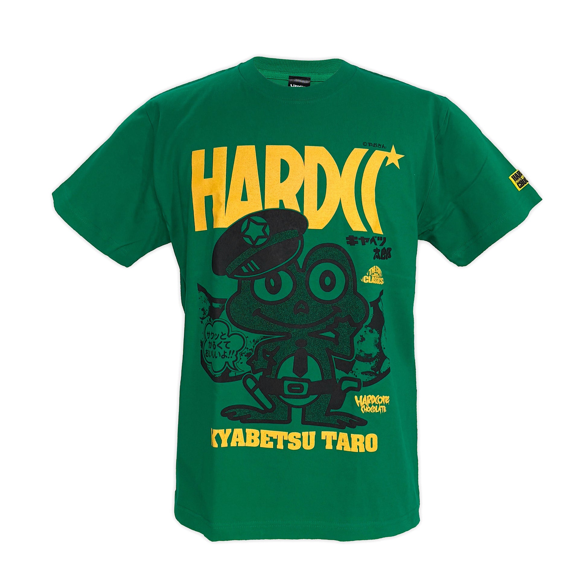 ハードコアチョコレートとのコラボは、緑色のパッケージをTシャツボディにし、カエルの警察官を大きく配置。