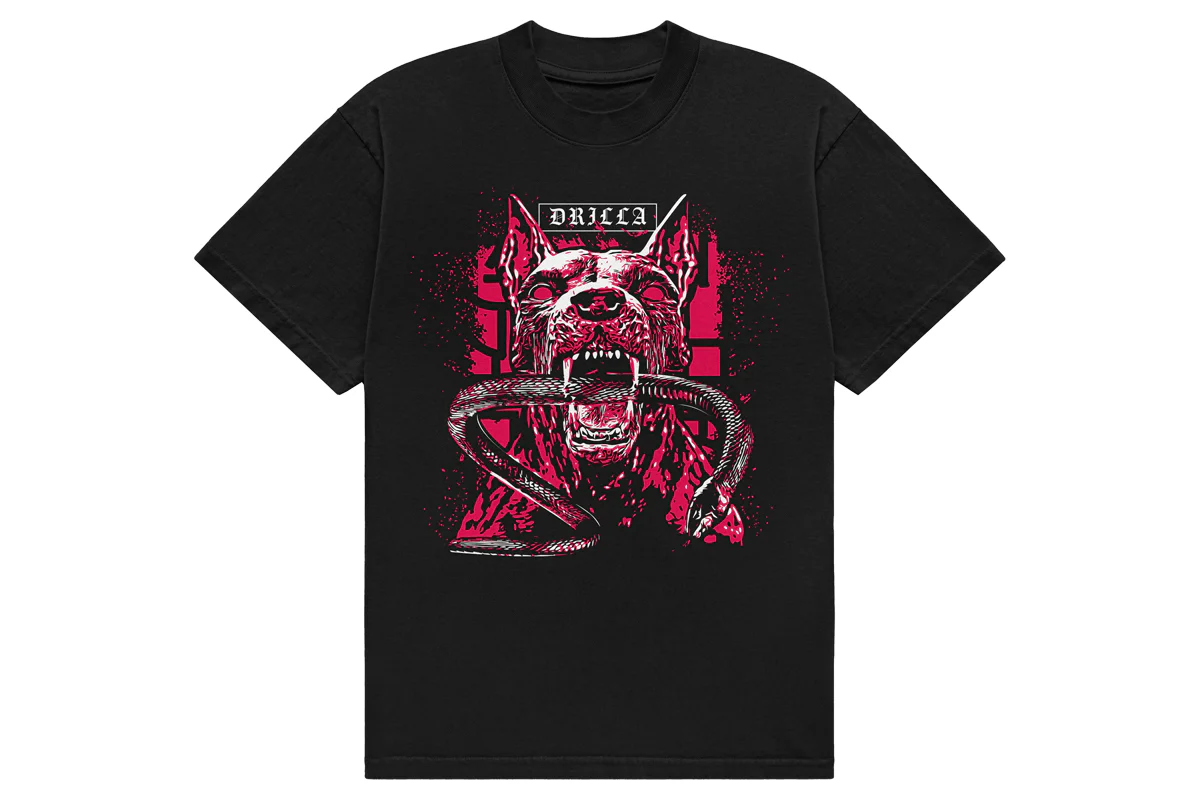 筋骨隆々の猛犬が蛇に噛み付いているアートワーク。